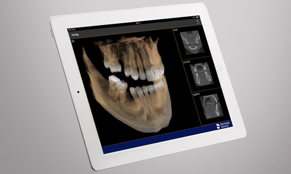 Utilice una iPad para analizar la imagen de rayos X. Las funciones de marca y zoom o comparar las imágenes antiguas le ayudaran en su consulta individual.