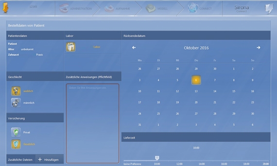 The practice uploads the 3D model to the Connect Case Center in just seconds and completes the digital order sheet. The desired dental laboratory is then selected and the order data transmitted.