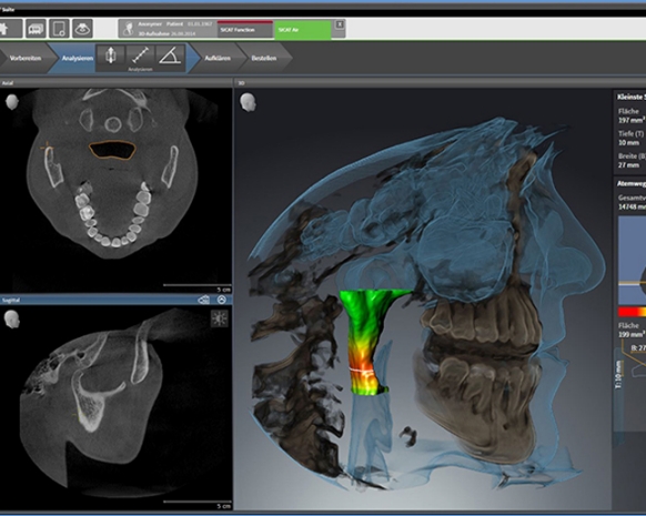 SICAT Air este prima soluție 3D care permite nu numai analiza căilor aeriene superioare, ci și vizualizarea și planificarea tratamentului bazat pe aparate, respectând detaliile anatomice. Combinația dintre imaginile radiologice 3D ale pacientului și datele suprafeței optice permite un flux de lucru complet digital.